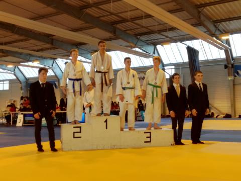 -38: Nous avions deux judoka et les deux sont qualifiés au région. Boutouha Karim monte de catégorie mais finit sur la troisième marche du podium. Tandis que Caignon Arthur termine à la 5ème place après un magnifique parcours.