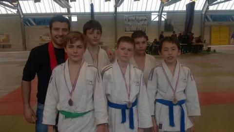 CORNE Chloé (-63), JOUAN Sullivan (-60), TASSEL Mathieu (-46), REGENET Jules (-42) montent sur la troisième marche du podium. Chloé gagne deux combat ets en perd deux. Il y a du mieux mais il faut maintenant varier son judo et etre active au sol. Sullivan m'a fait vraiment plaisir. Il travail dur et sa paie enfin. Il a fait de gros progrès et cette troisième place est largement mérité. Mathieu ne dire rien sur les cours, il est discret mais quelques judoka. Deux uchi mata et un papier cadeau pour aller en demi. Il se fait contrer en demi alors que son idée d'avant arrière était bonne. On ne peut pas lui reprocher d'avoir essayer. En place de trois, de nouveau papier cadeau. Quand a Jules, il perd en demi parce qu'il veut trop calculer et il ne sait pas le faire. Dommage. Il remporte quand même sa place de trois sur un magnifique ippon seoi coté revers.